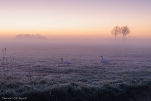 En wauw Moeder Natuur trakteert mij op een gave zonsopkomst, nevel over de akkers en als kers op de taart twee sierlijke zwanen die het plaatje compleet maken.
